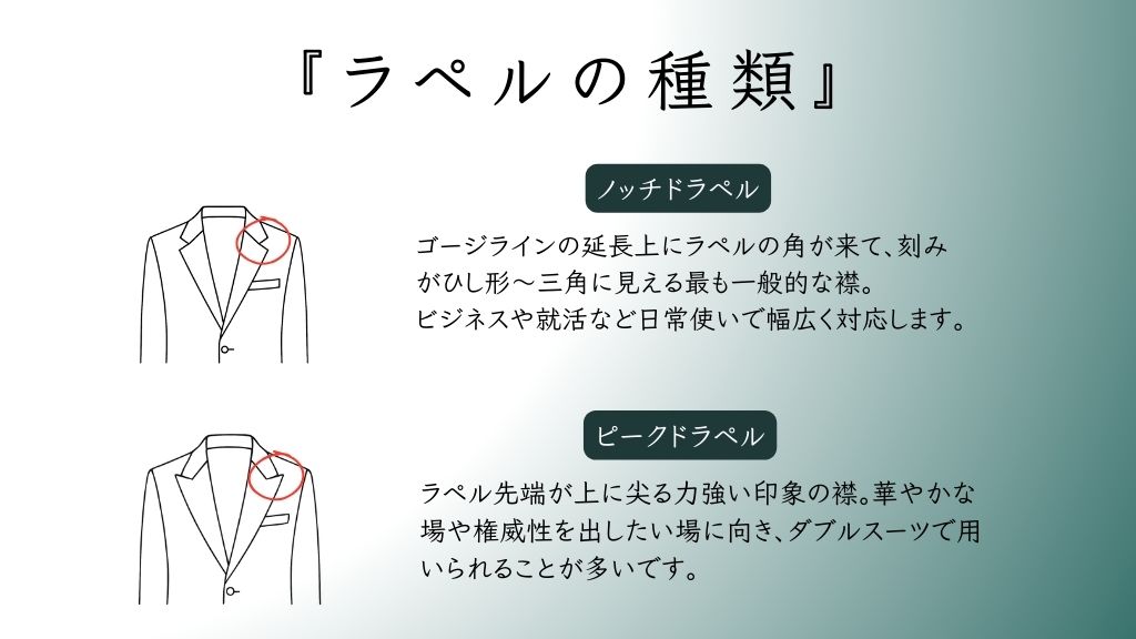 - ラペル:細すぎない幅(7.5〜9cm)。写真で貧弱に見えません。